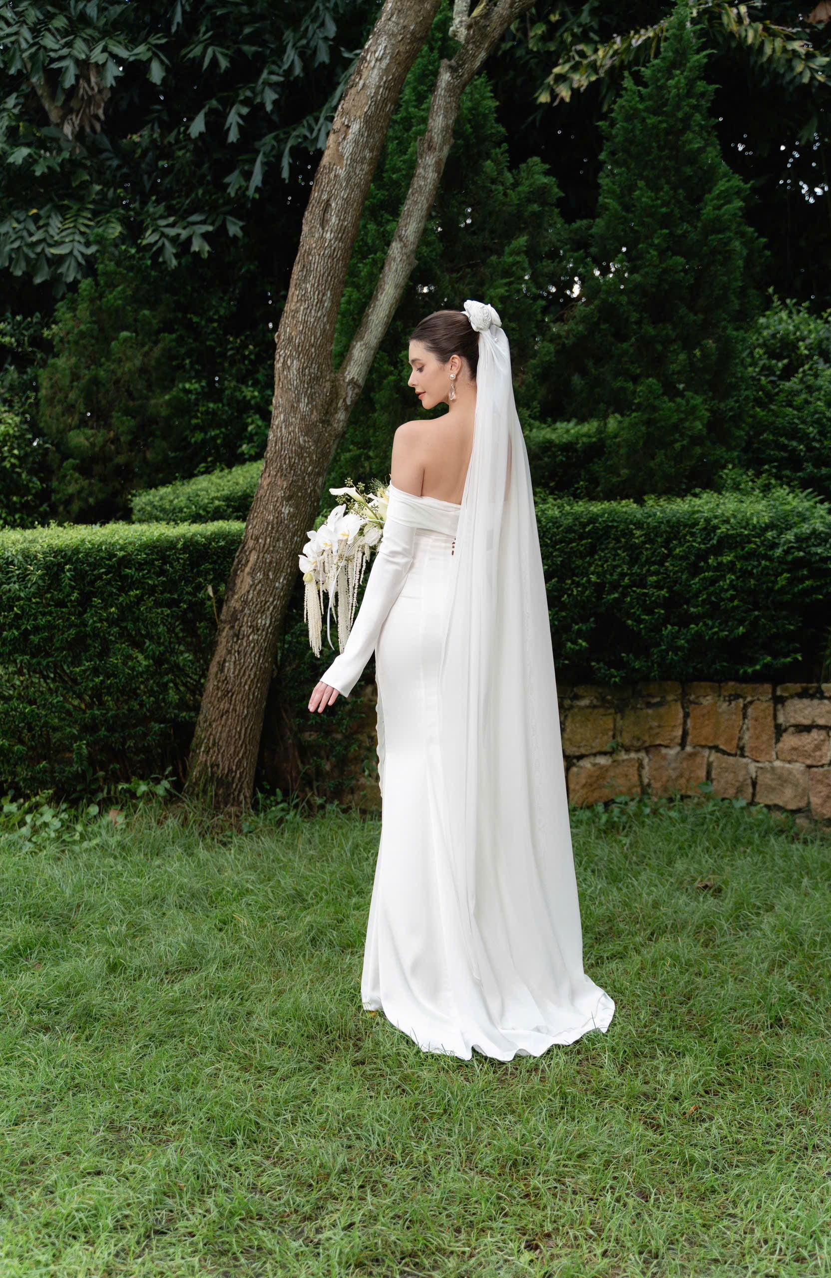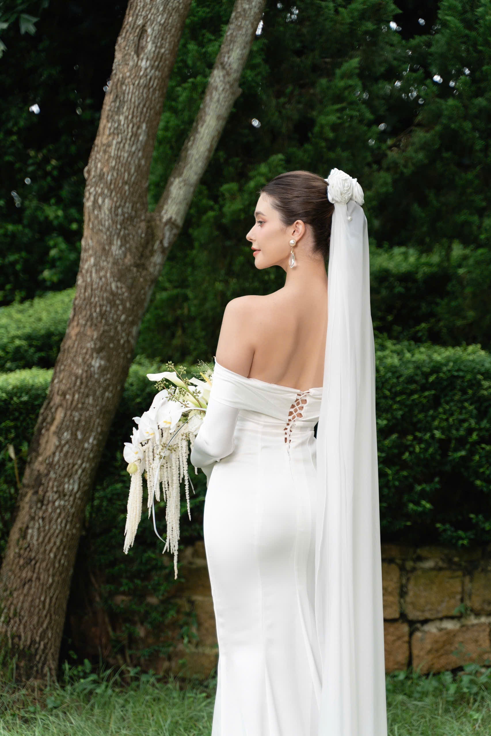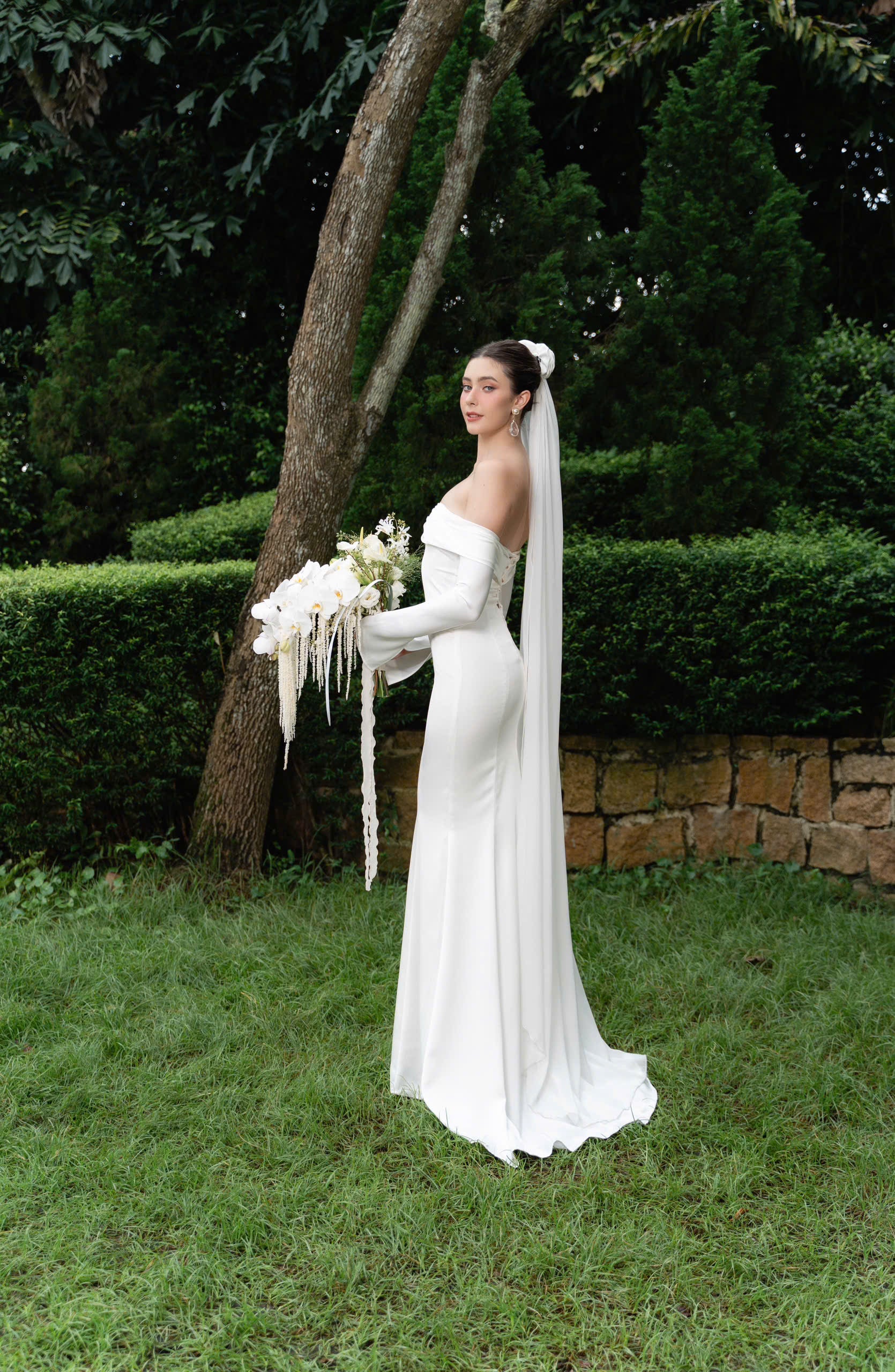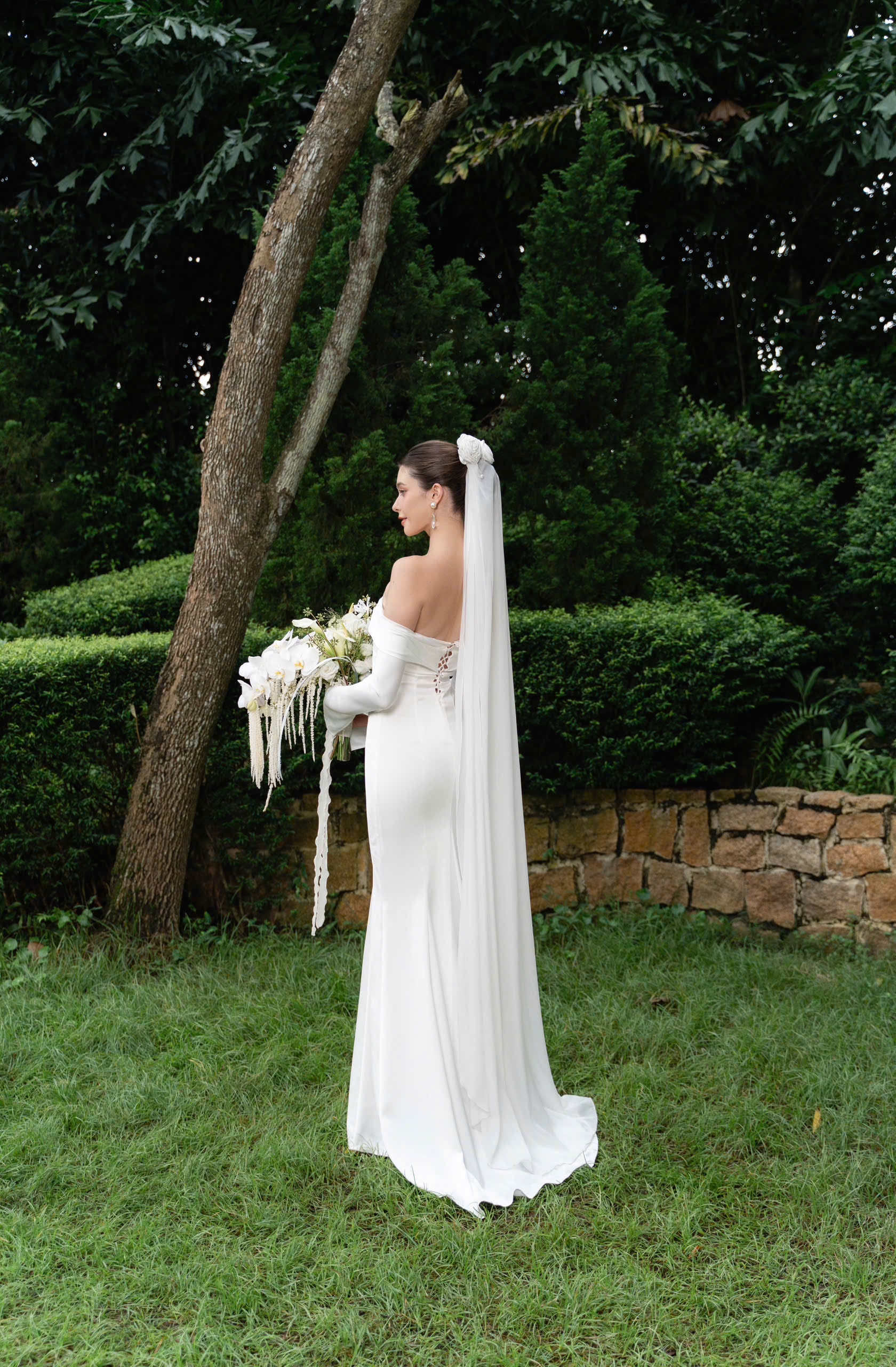 The Mortica silk gown is an elegant design featuring a floor-length silhouette with a long tail, creating a soft and graceful look. The off-shoulder detail highlights the wearer's sensual shoulders, paired with long sleeves that are slit at the wrists for a touch of refinement and uniqueness. At the back, a lace-up detail allows for easy adjustment, ensuring a flattering fit that accentuates the waistline. Crafted from premium silk, the dress exudes luxury and smoothness, making it perfect for special occasions when you want to stand out with a sophisticated, classy style.