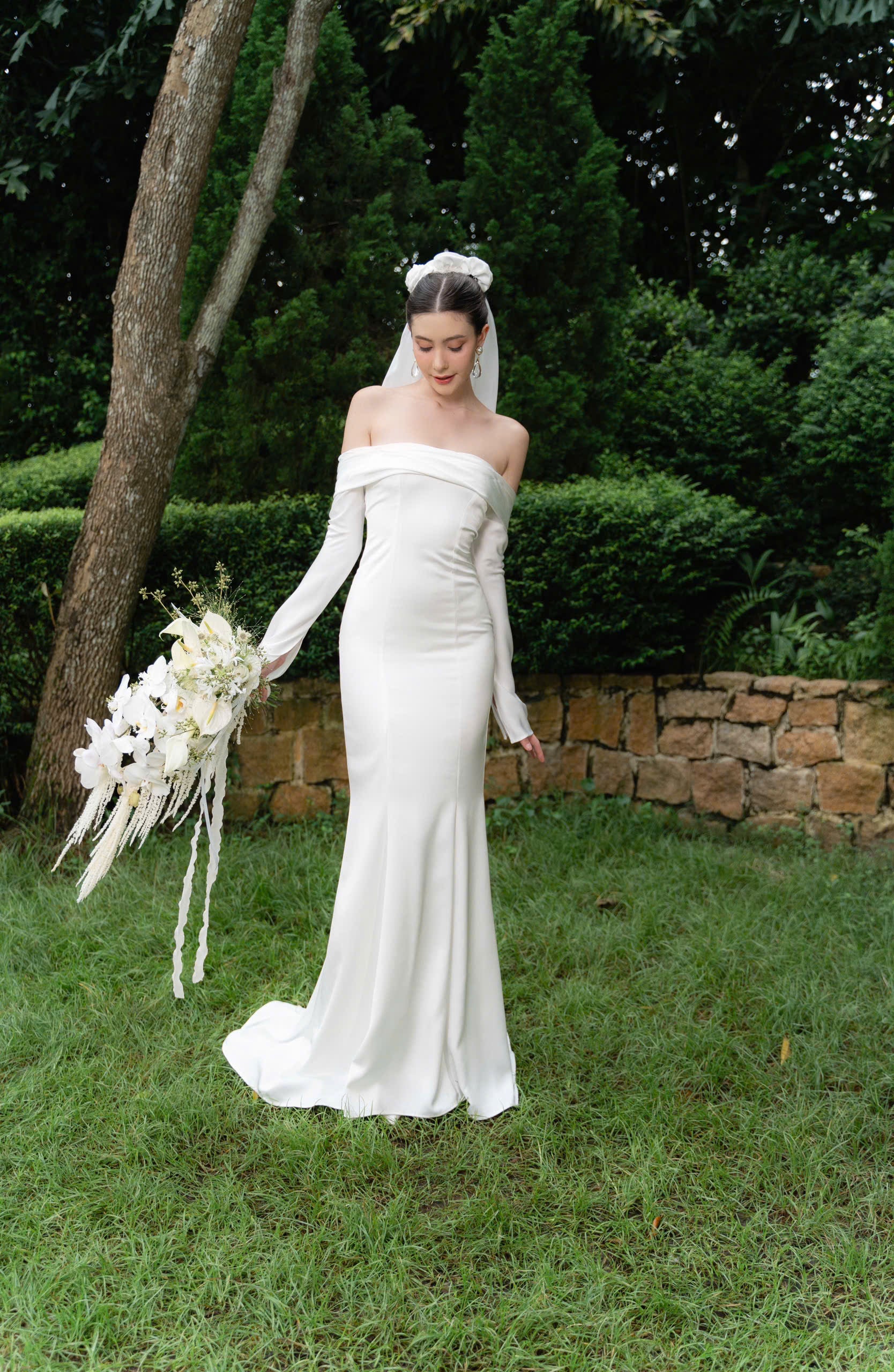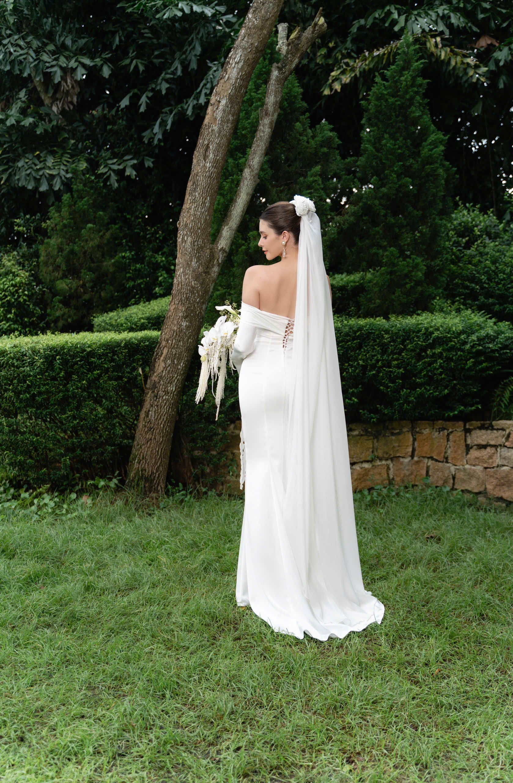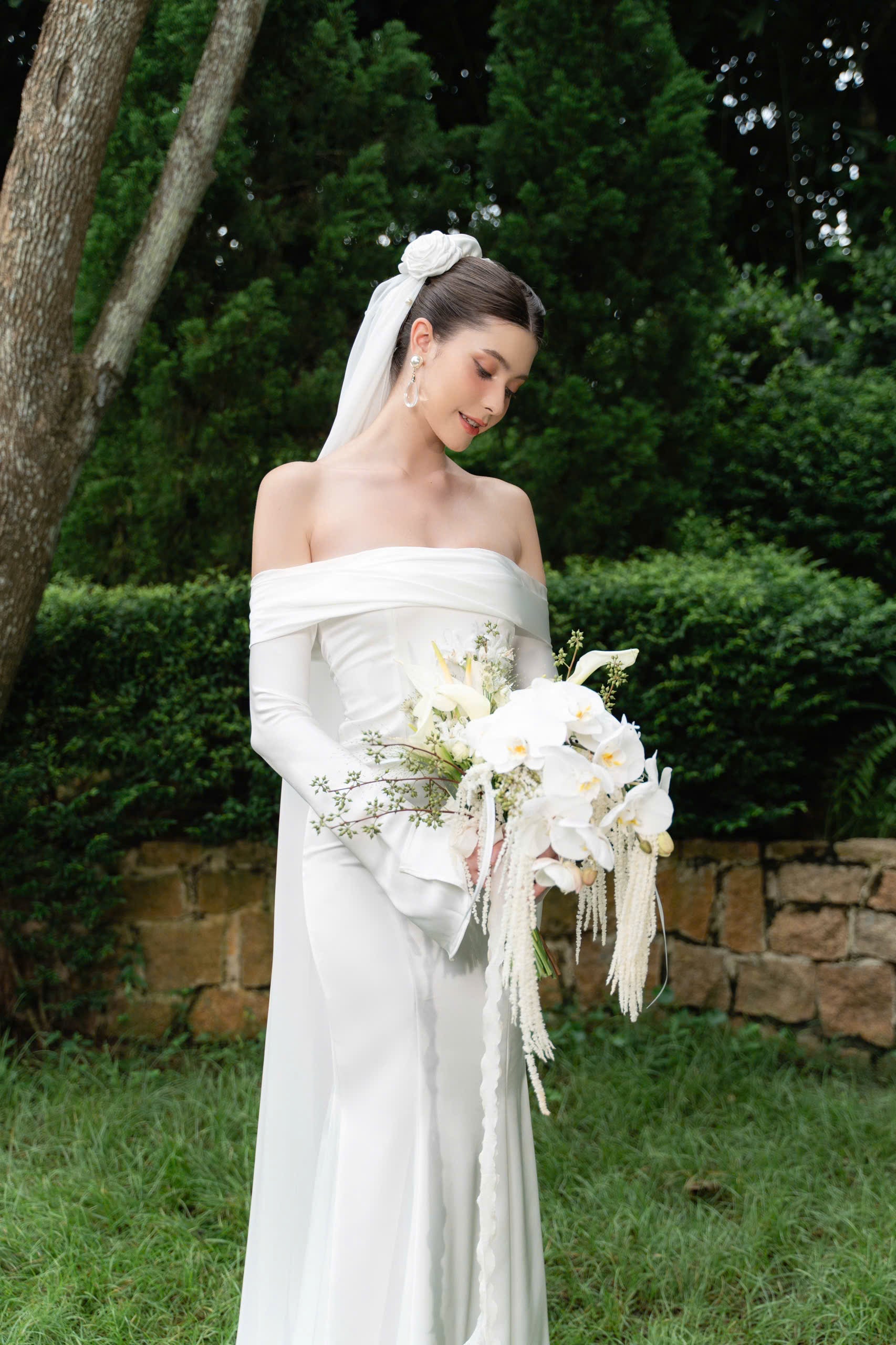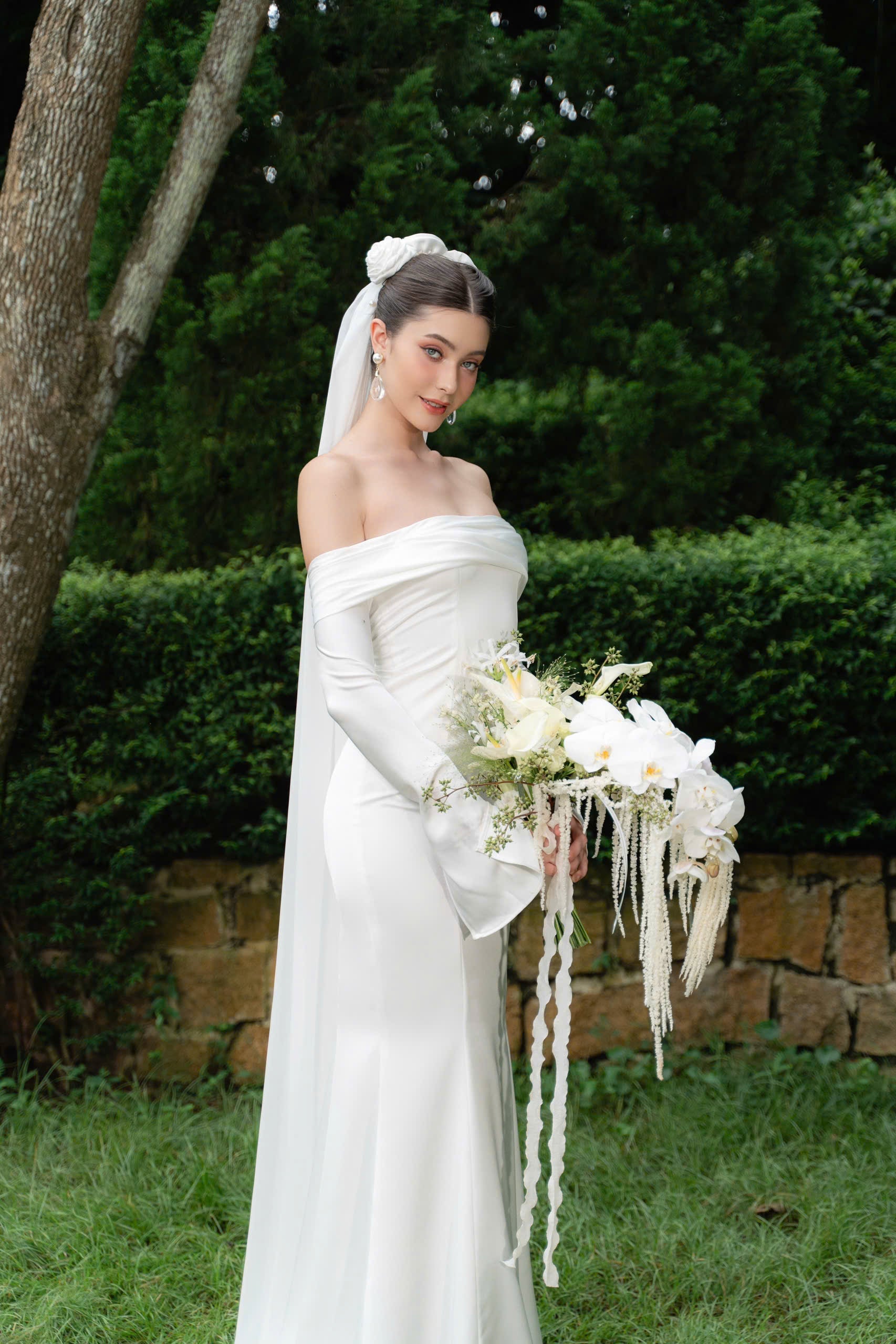 The Mortica silk gown is an elegant design featuring a floor-length silhouette with a long tail, creating a soft and graceful look. The off-shoulder detail highlights the wearer's sensual shoulders, paired with long sleeves that are slit at the wrists for a touch of refinement and uniqueness. At the back, a lace-up detail allows for easy adjustment, ensuring a flattering fit that accentuates the waistline. Crafted from premium silk, the dress exudes luxury and smoothness, making it perfect for special occasions when you want to stand out with a sophisticated, classy style.