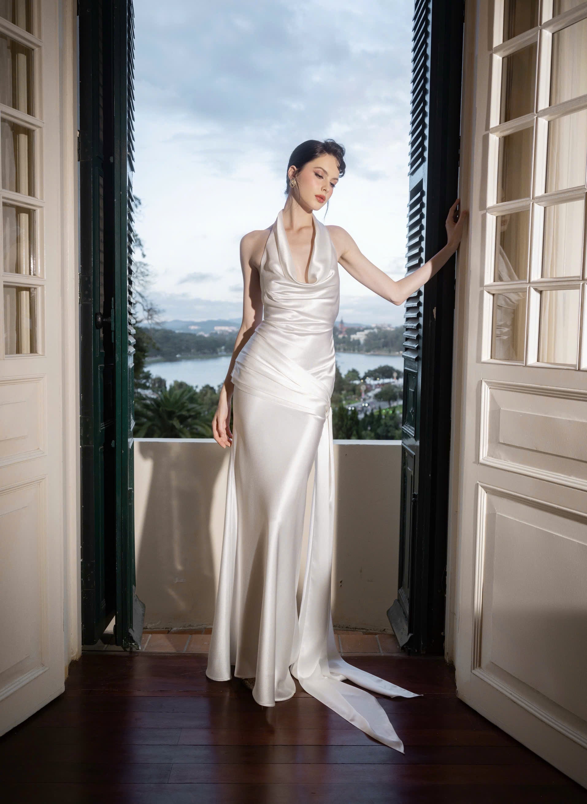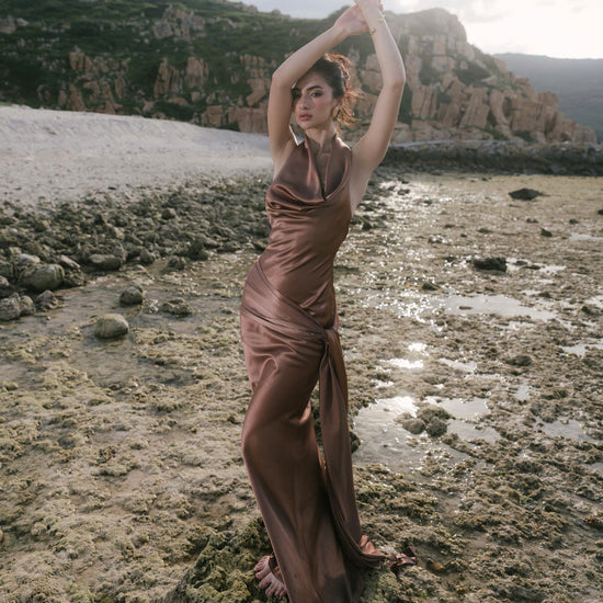 A dress that moves like liquid light, ODETTE features a soft cowl neckline and fluid silk that gracefully contours the silhouette.