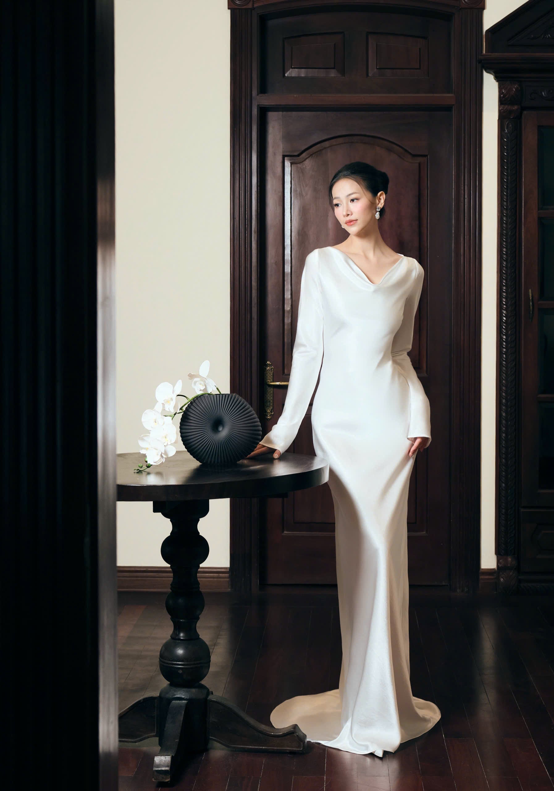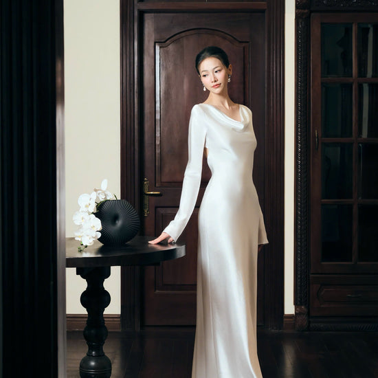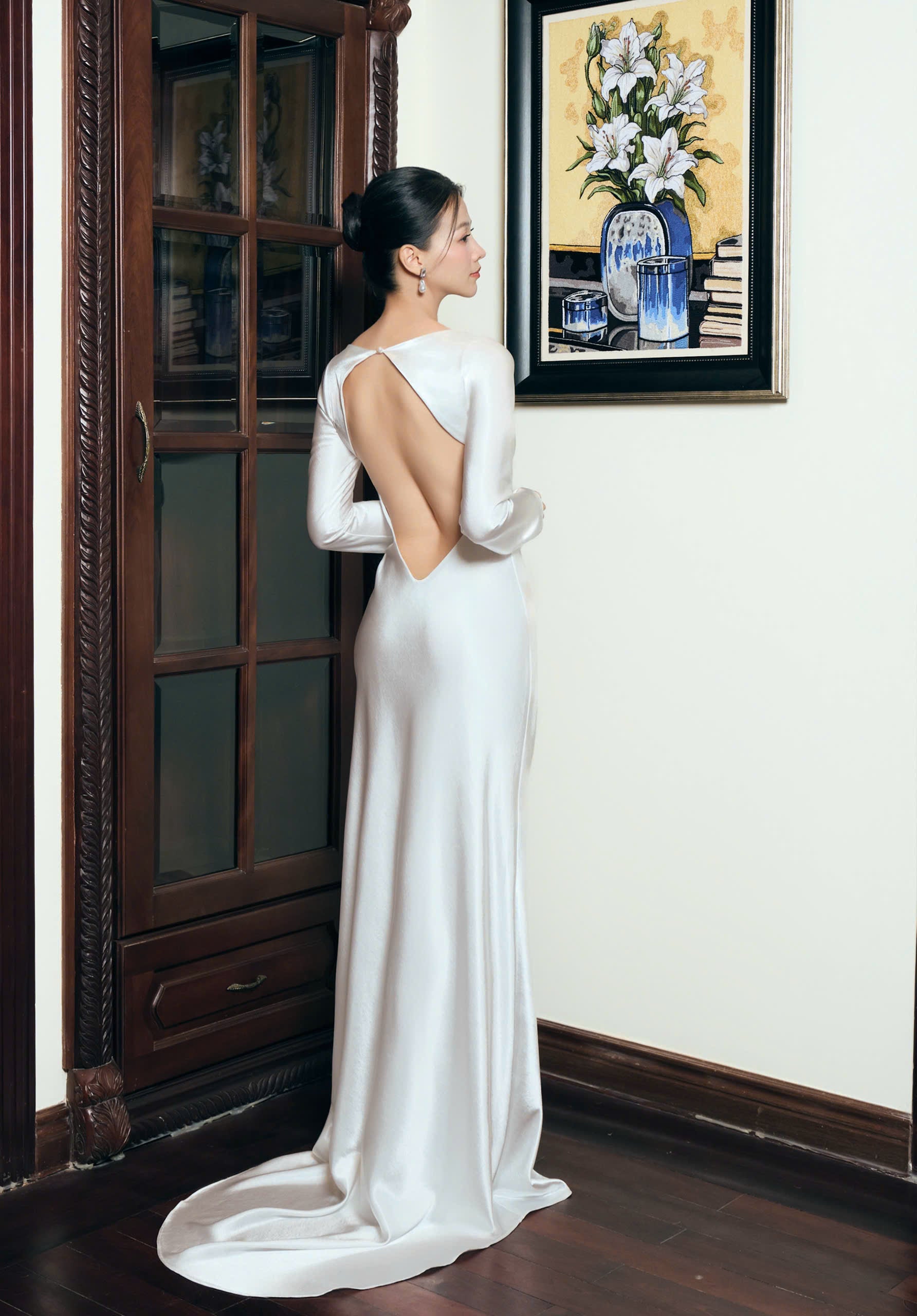 An elegant beauty reserved for the most refined occasions. SOLIRA is crafted from luminous pearl silk charmeuse, its smooth, light-catching surface offering a sense of luxury that is subtle rather than showy. The sleek, elongated silhouette delicately contours the body, while the artfully deep open back adds a touch of restrained allure and femininity.