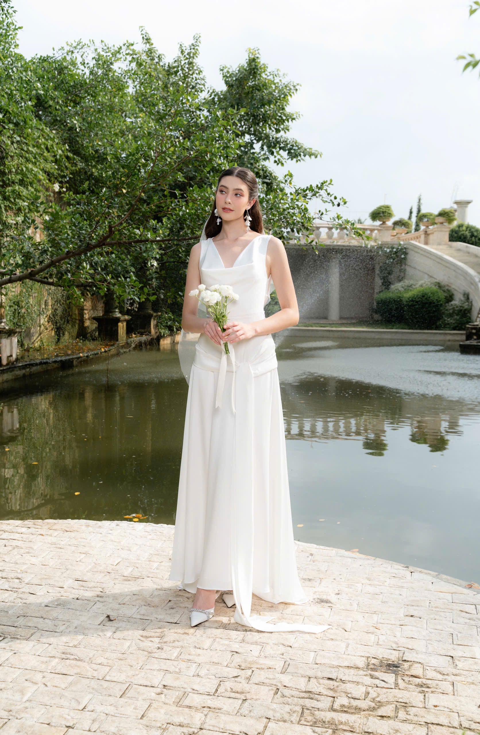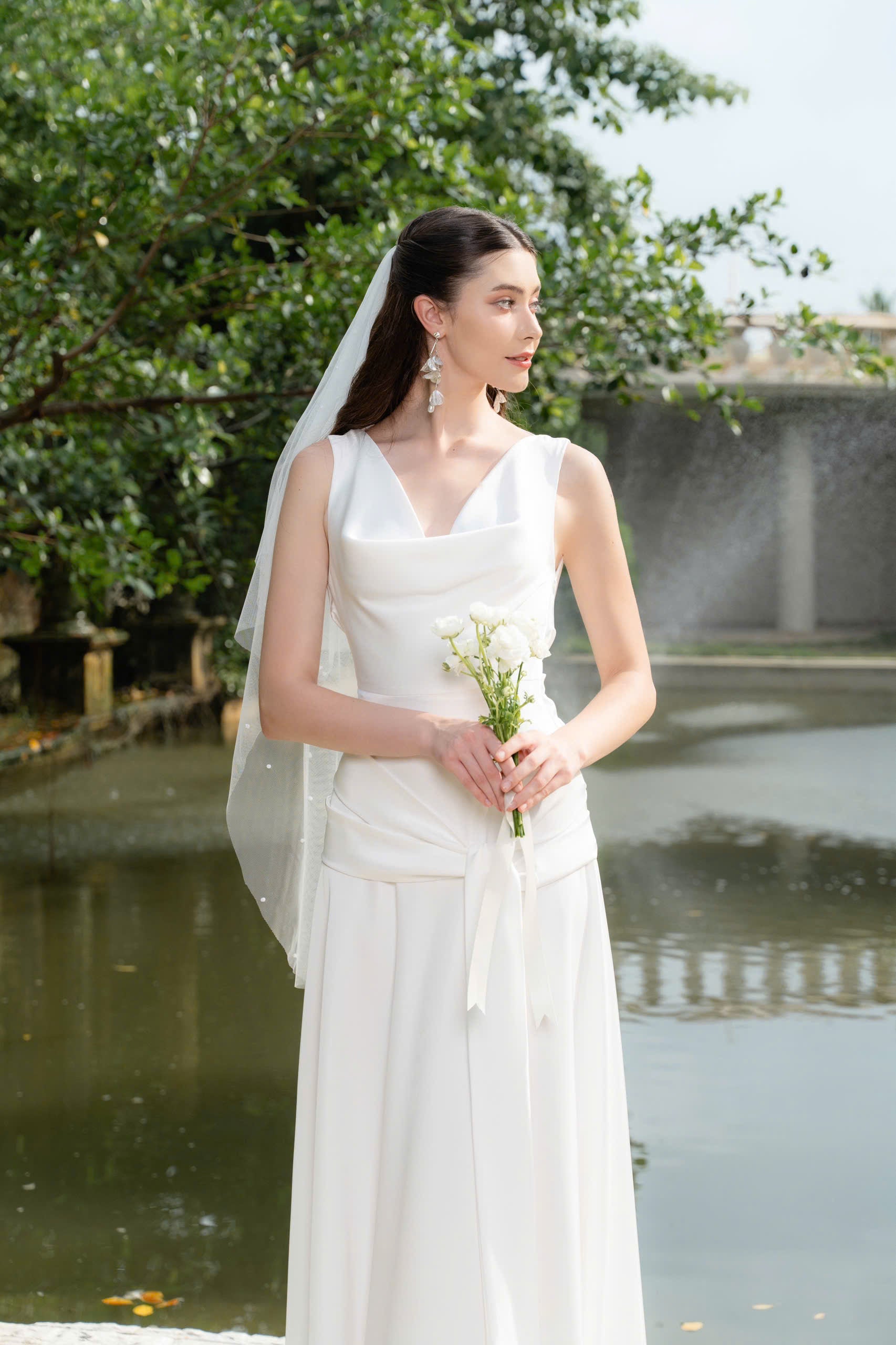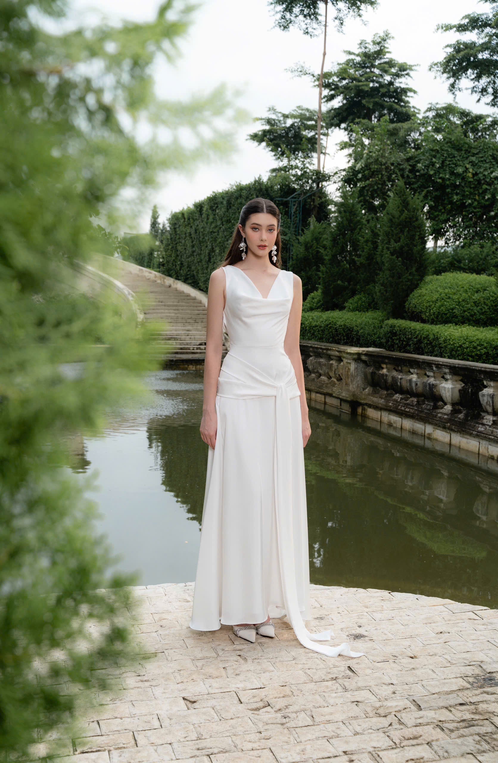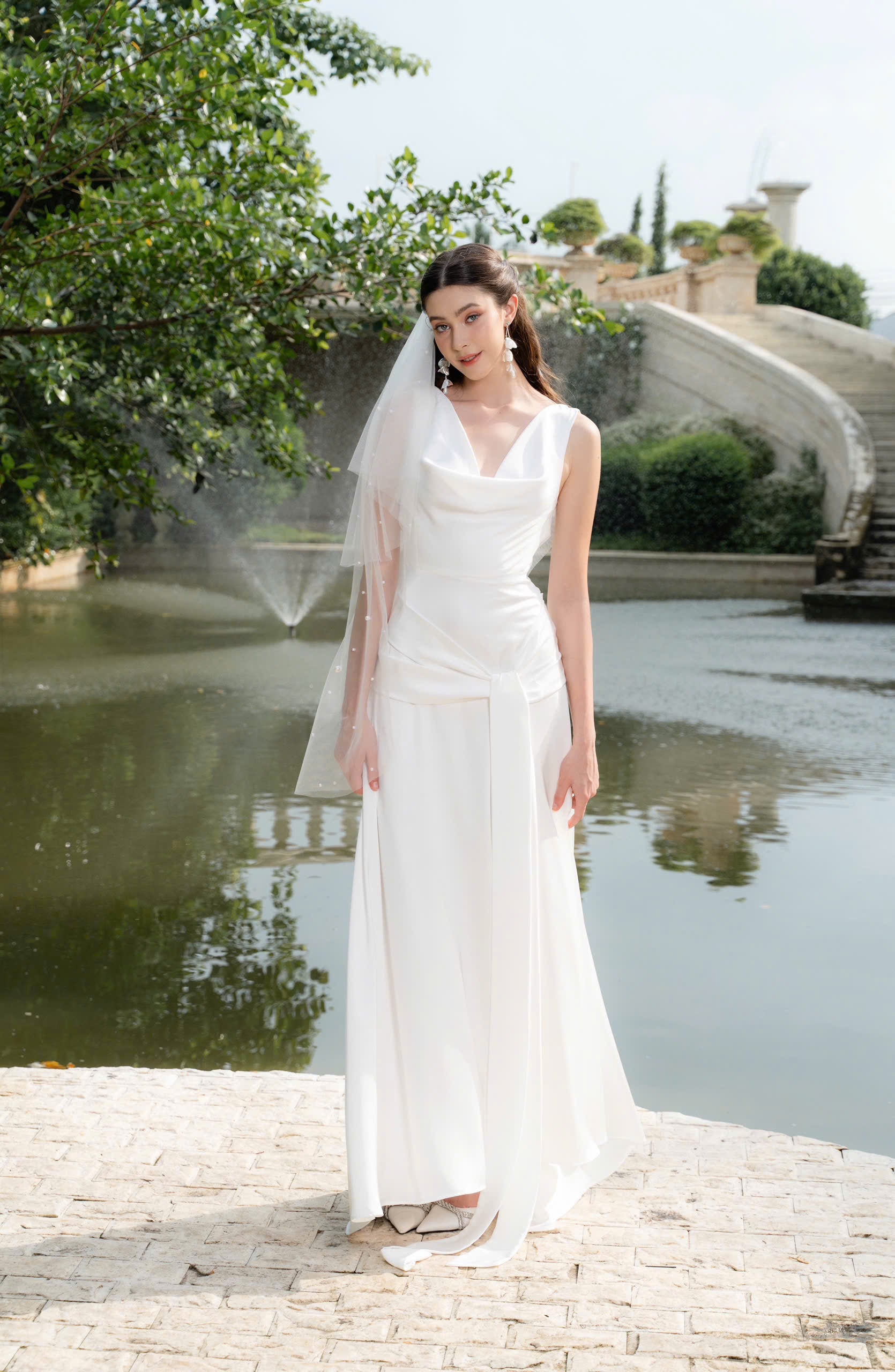 Chiếc đầm lụa trắng VENESSA mang đến vẻ đẹp thanh thoát, tinh khôi với phần cổ xẻ nhẹ nhàng và đường thắt eo tinh tế, giúp tôn lên dáng vẻ duyên dáng của cô dâu. Thiết kế đơn giản nhưng không kém phần sang trọng với lớp vải lụa mềm mại rủ xuống, tạo cảm giác bồng bềnh mỗi khi di chuyển. Phần lưng khoét sâu mang đến vẻ gợi cảm, kết hợp hoàn hảo với sự tinh tế của các chi tiết xếp ly. Đây là sự lựa chọn lý tưởng cho những cô dâu yêu thích sự tinh giản nhưng vẫn toát lên nét đẹp nữ tính và hiện đại trong ngày trọng đại của mình.