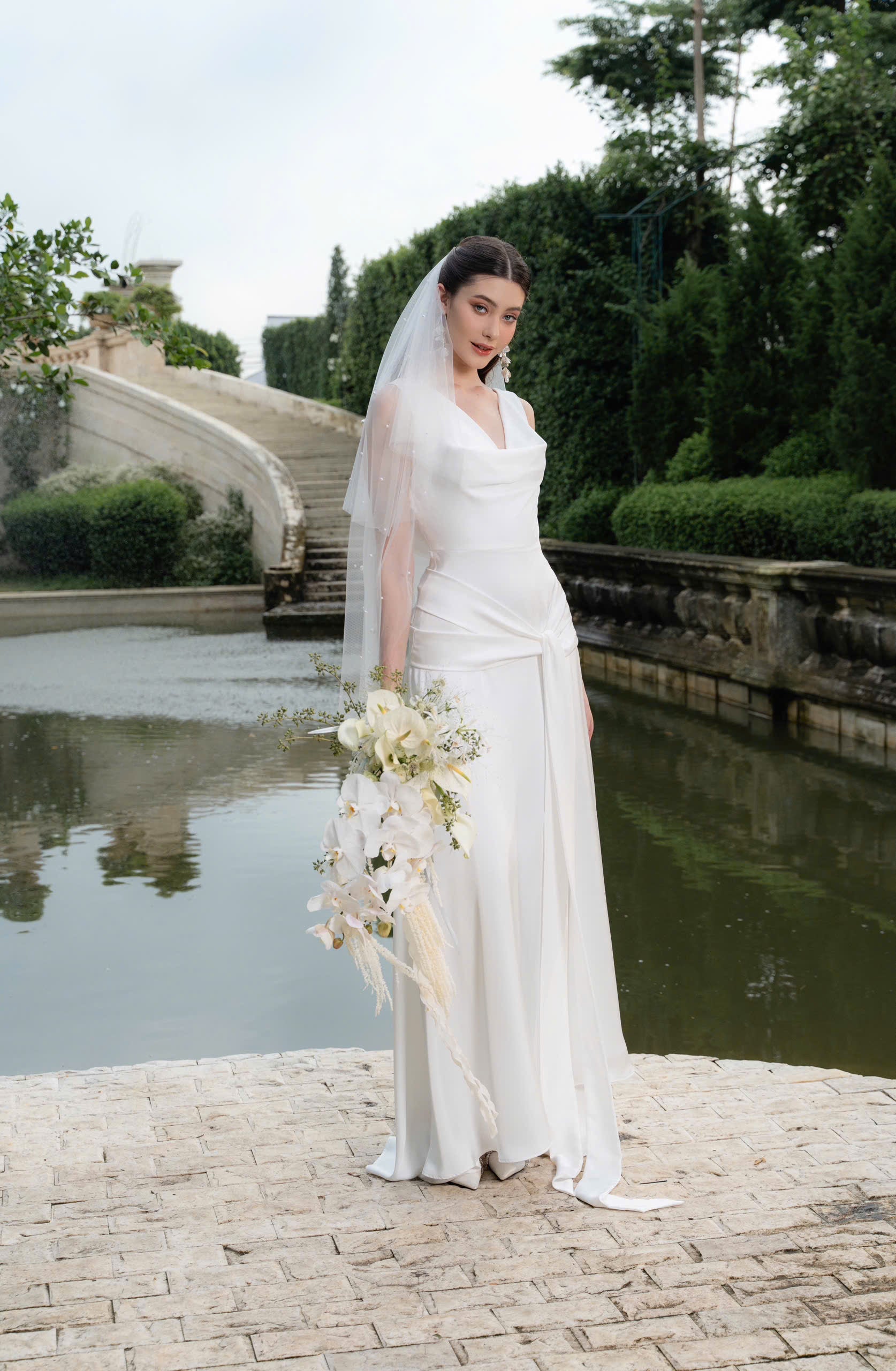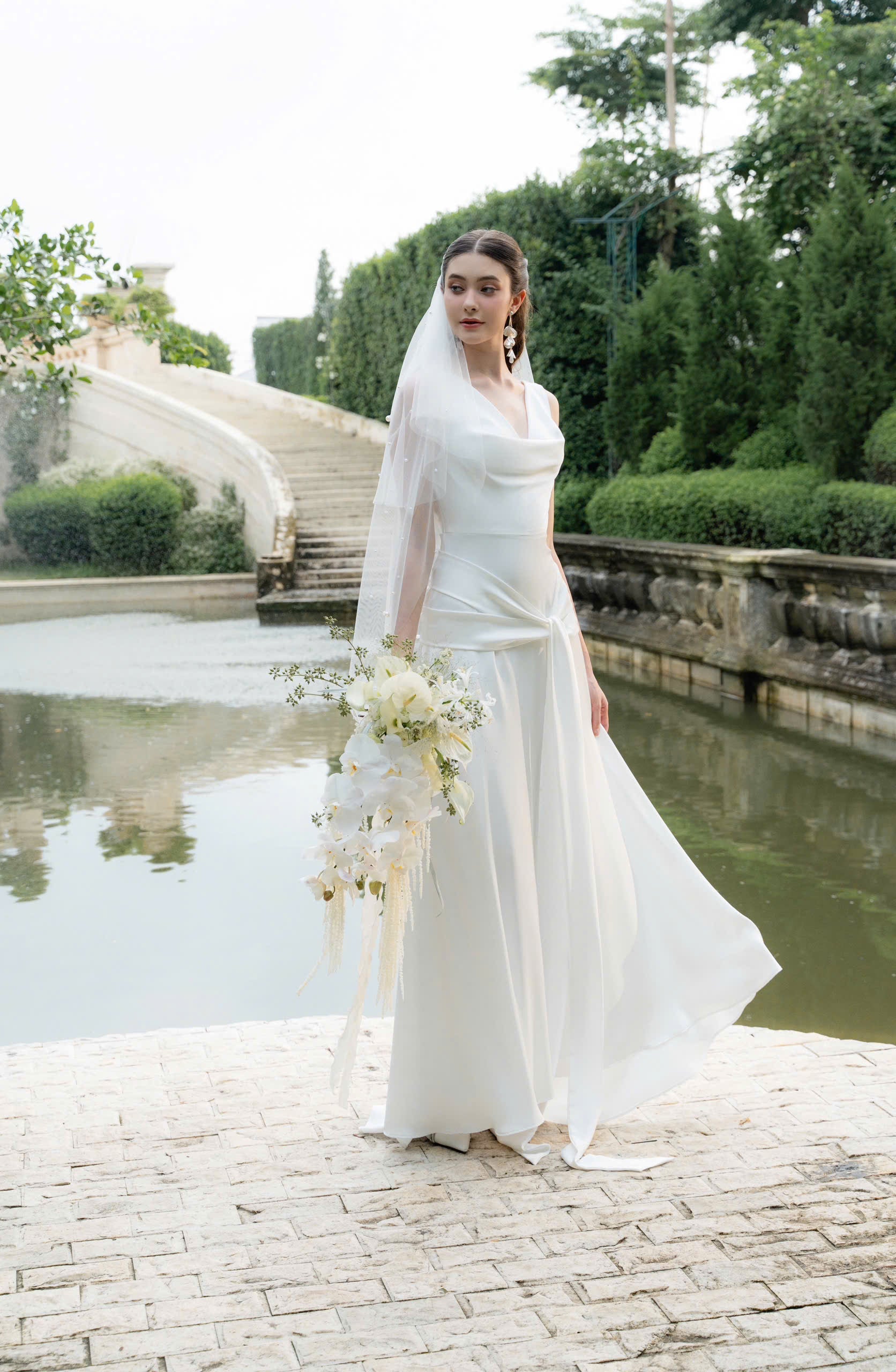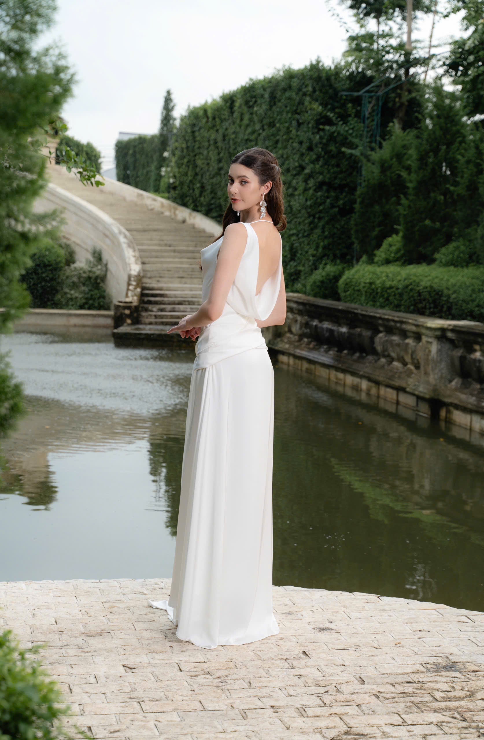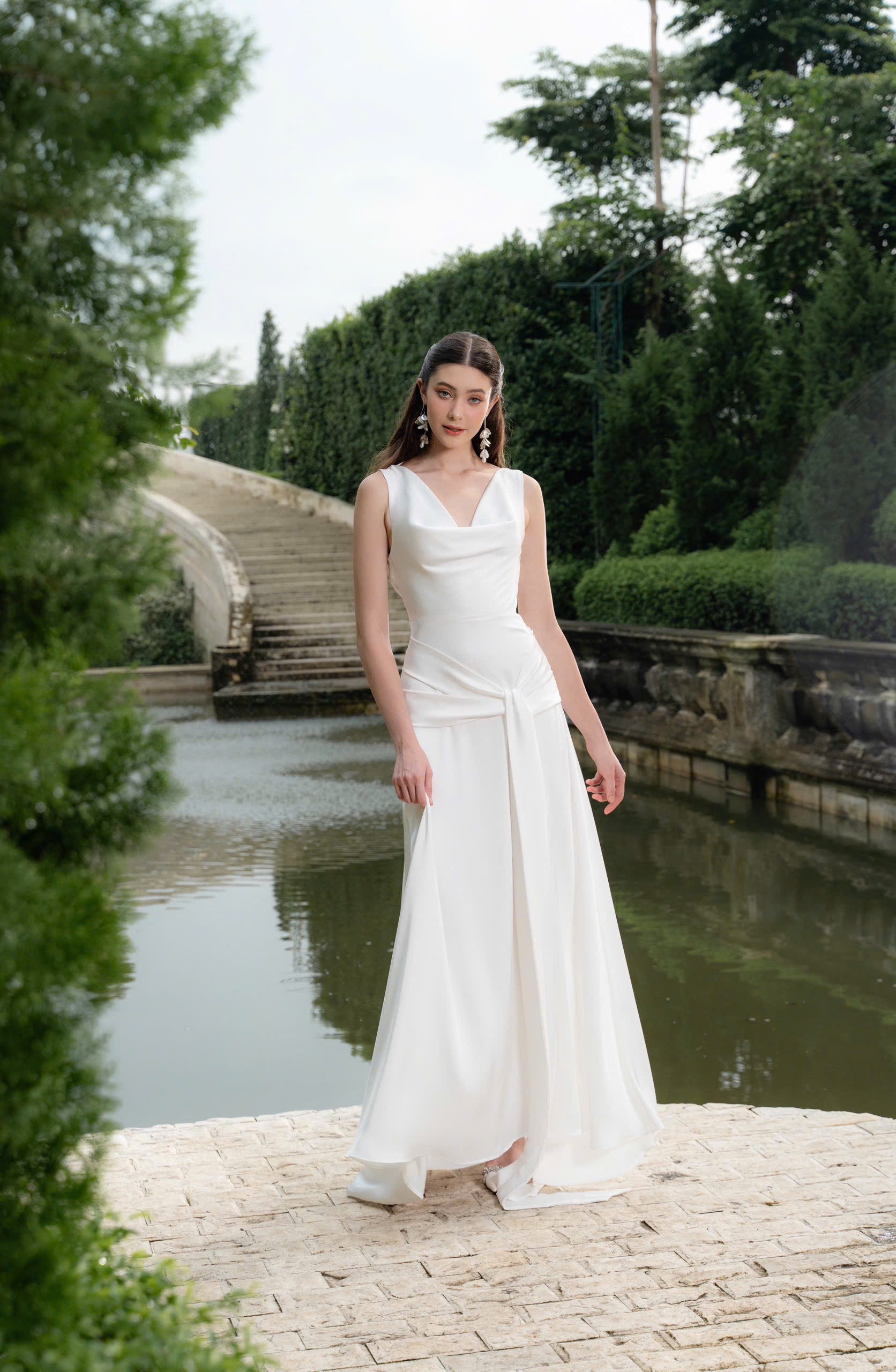 Chiếc đầm lụa trắng VENESSA mang đến vẻ đẹp thanh thoát, tinh khôi với phần cổ xẻ nhẹ nhàng và đường thắt eo tinh tế, giúp tôn lên dáng vẻ duyên dáng của cô dâu. Thiết kế đơn giản nhưng không kém phần sang trọng với lớp vải lụa mềm mại rủ xuống, tạo cảm giác bồng bềnh mỗi khi di chuyển. Phần lưng khoét sâu mang đến vẻ gợi cảm, kết hợp hoàn hảo với sự tinh tế của các chi tiết xếp ly. Đây là sự lựa chọn lý tưởng cho những cô dâu yêu thích sự tinh giản nhưng vẫn toát lên nét đẹp nữ tính và hiện đại trong ngày trọng đại của mình.