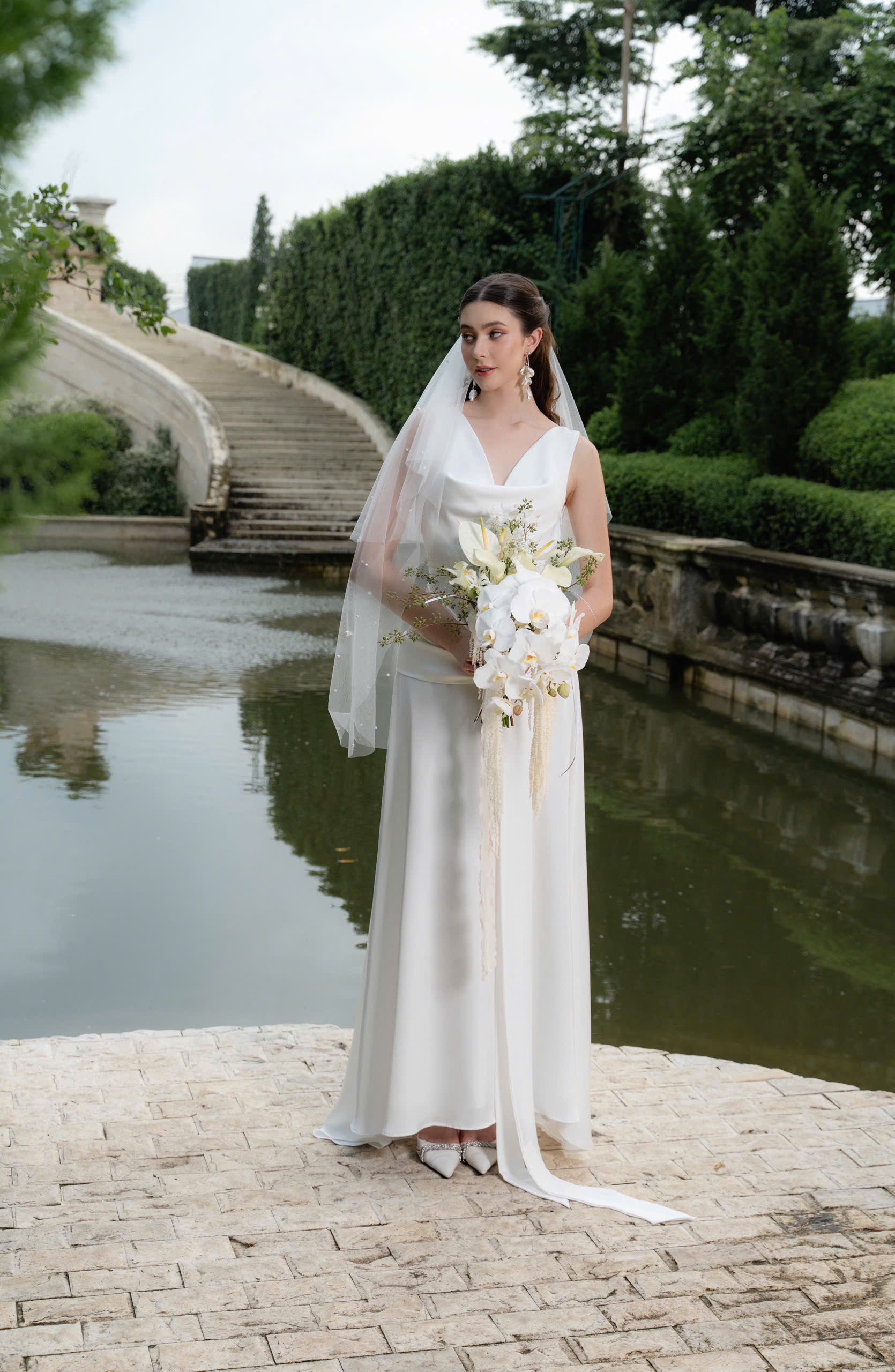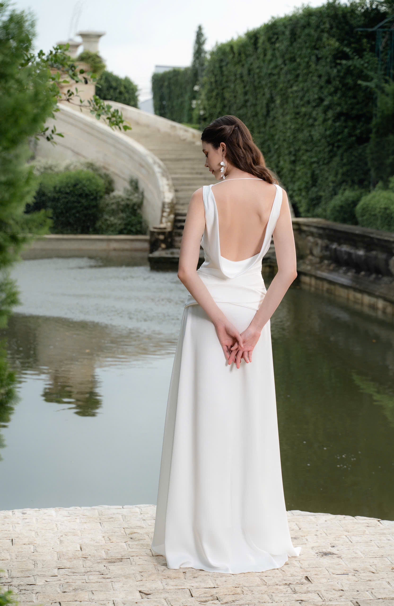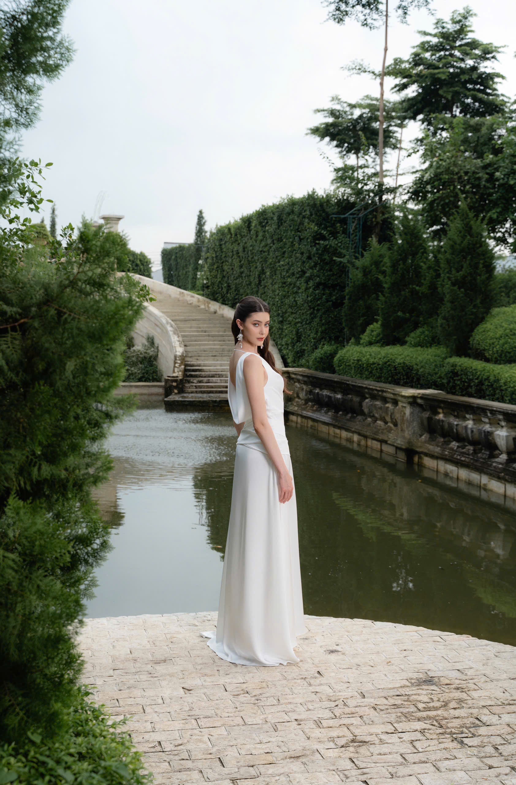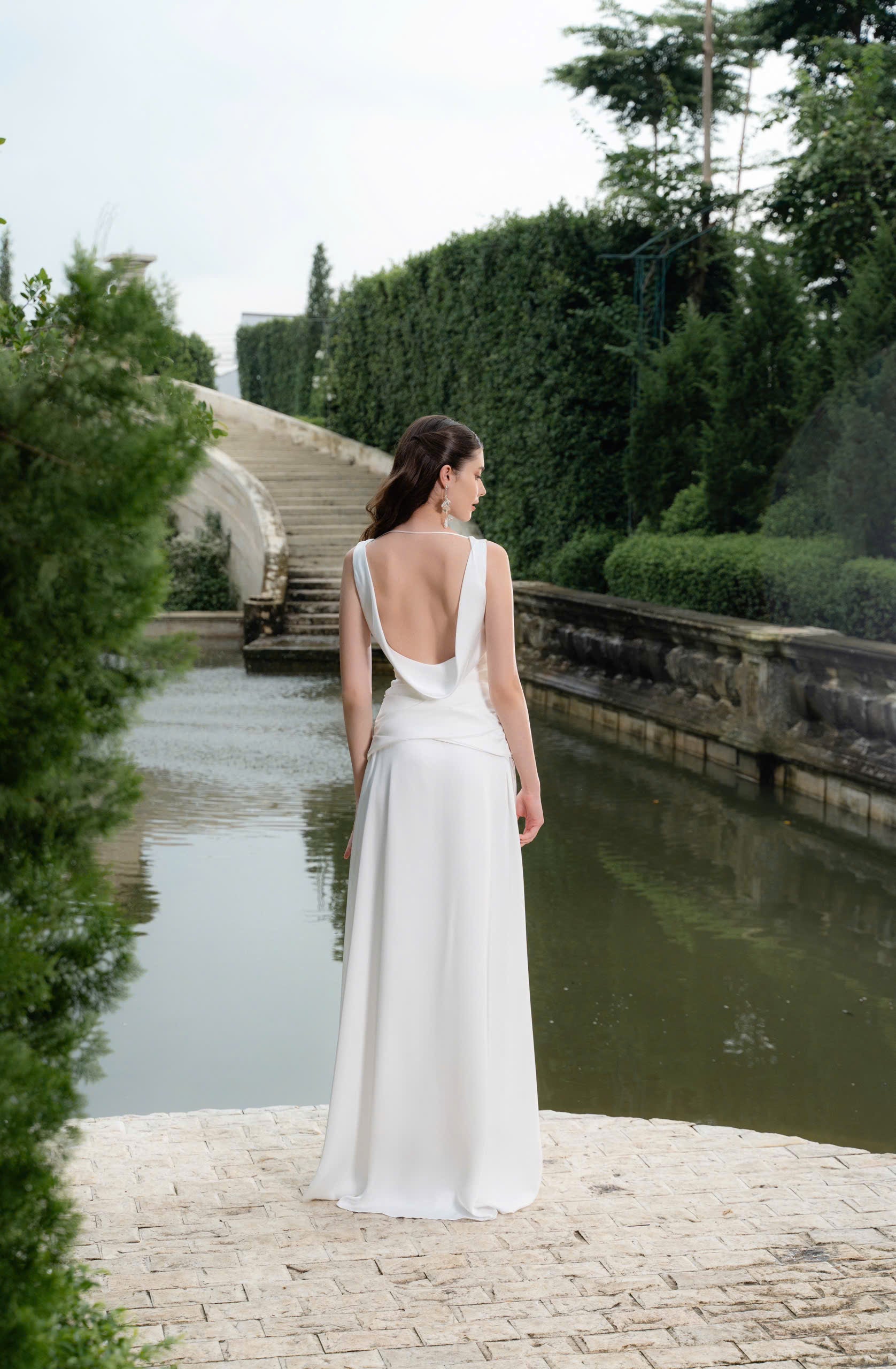 The white VENESSA DRESS brings a serene and pure beauty with a gently plunging neckline and a delicate waist tie that enhances the bride's graceful figure. The simple yet luxurious design features soft, flowing silk fabric that creates a billowing effect with each movement. The deep back adds a touch of sensuality, perfectly complementing the elegance of the pleated details. This is the ideal choice for brides who appreciate simplicity while still exuding a feminine and modern charm on their special day.