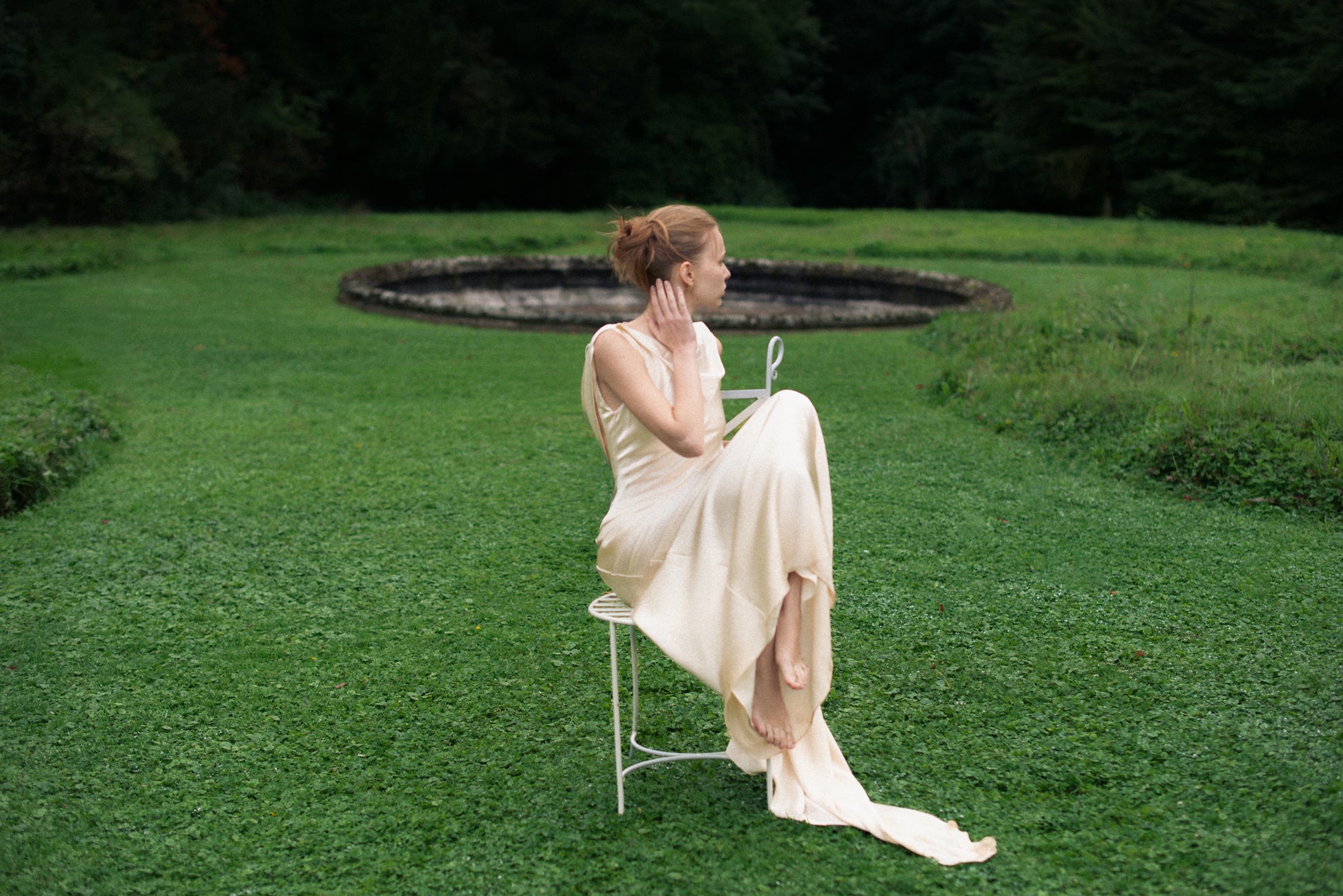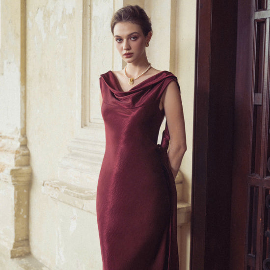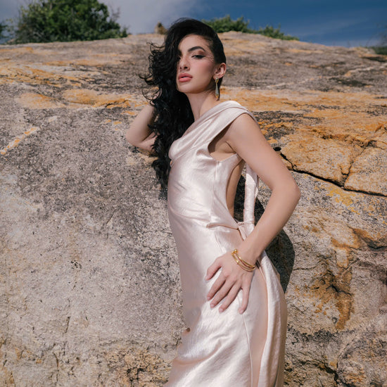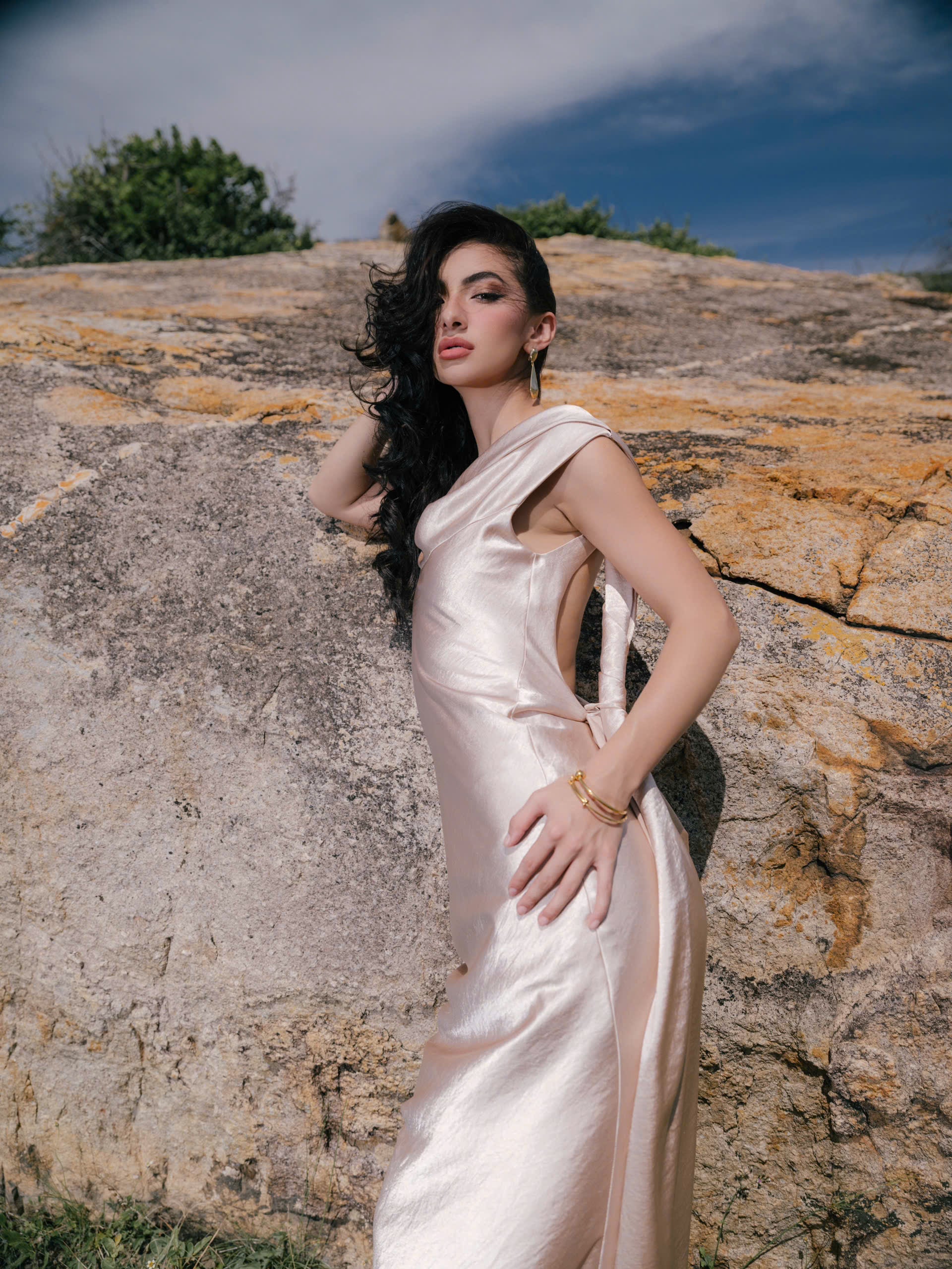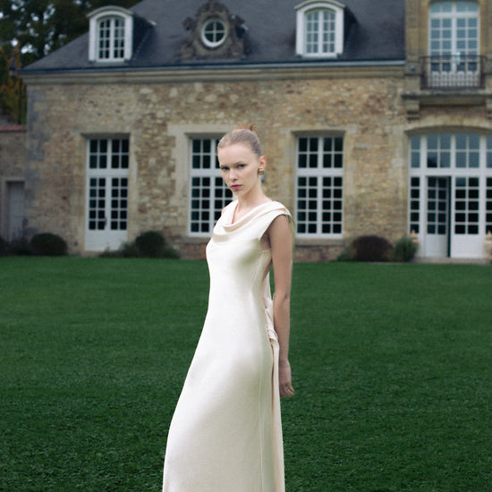 VIONNA is a full-length silk gown crafted to softly embrace the body’s natural curves with fluid elegance. Its neckline is designed for versatility, allowing two distinct styles: a gentle cowl neck or a seductive off-shoulder look, depending on the wearer’s mood and essence.